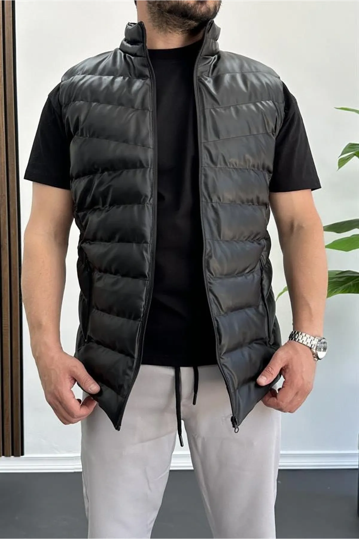 Erkek Slim Fit Fermuarlı Suni Deri Yelek Siyah Edw088